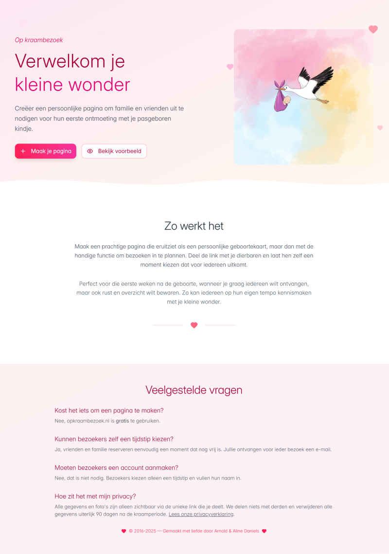 Maak een prachtige pagina die eruitziet als een persoonlijke geboortekaart, maar dan met de handige functie om bezoeken in te plannen.